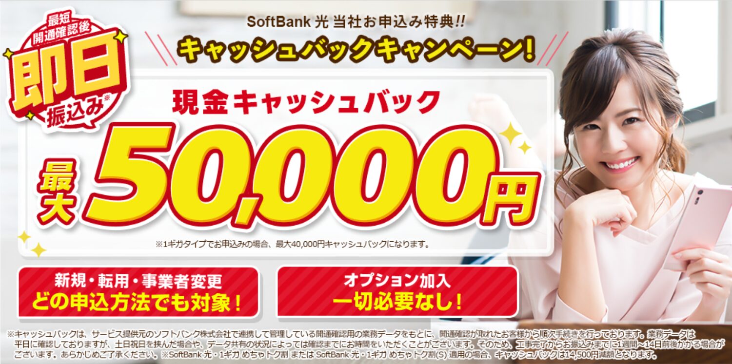 | 🏆 ソフトバンク光 | 5,720円 | 最大40,000円 | 最短2ヶ月 | SoftBankユーザー・早くキャッシュバックが欲しい人 |